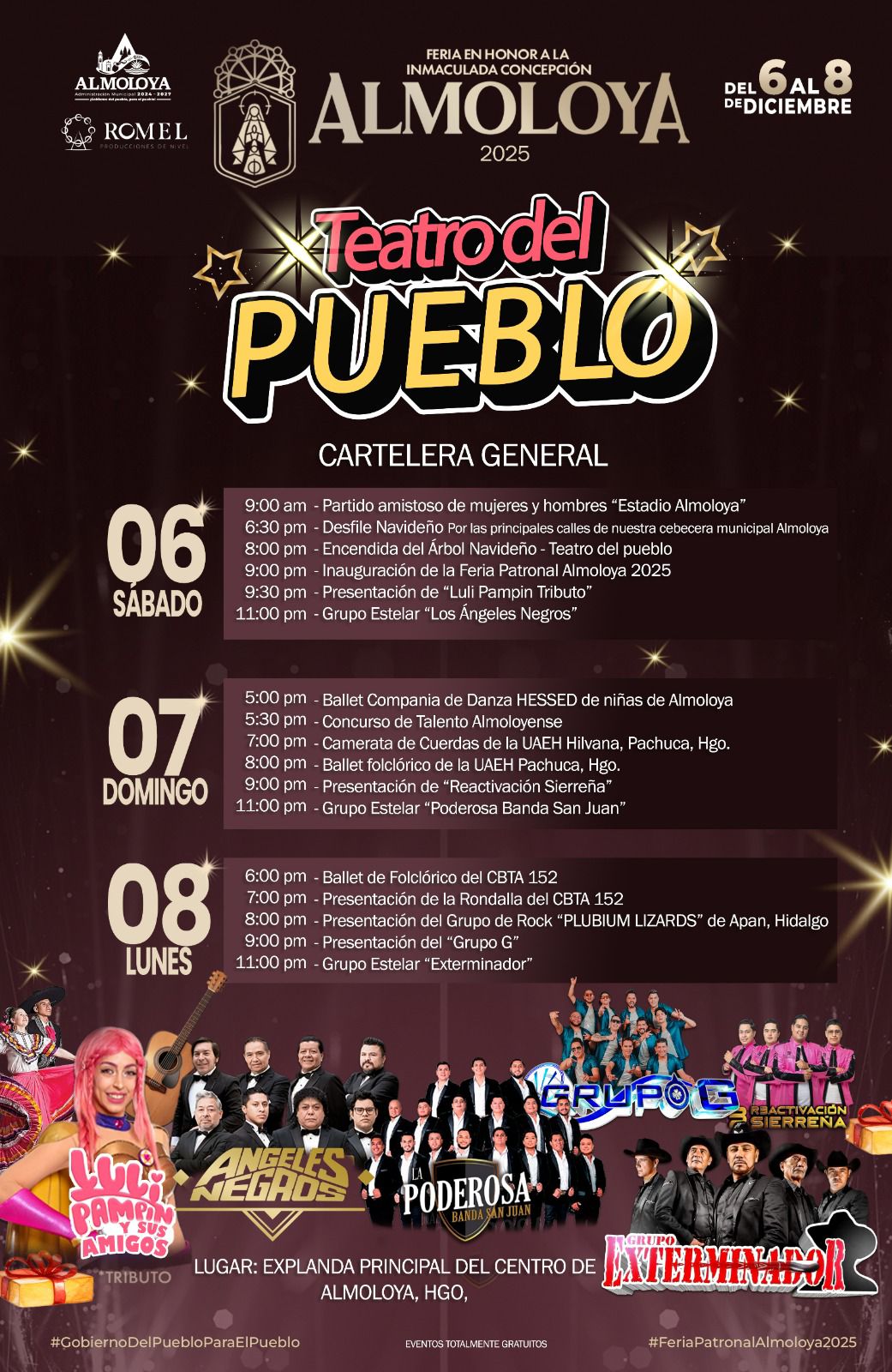 En honor a la Inmaculada Concepción se celebrará la Feria Almoloya Hidalgo 2025 del 6 al 8 de diciembre. Serán varios los eventos que se tienen programados ya, excelentes grupos y bailes jaripeo, así como rodeos con importantes ganaderías.
