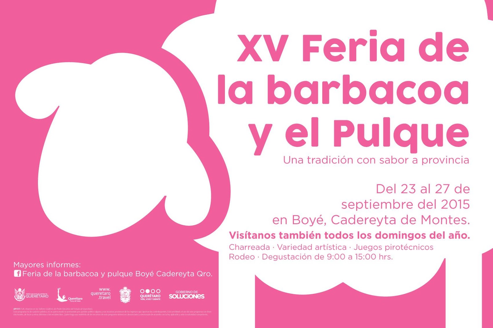 Disfruta de la mejor barbacoa y el mejor pulque en la XV Feria de la Barbacoa y el Pulque 2015 en Boyé, Cadereyta, Querétaro, del 23 al 27 de septiembre. Esta feria es ya toda una tradición en la región y si quieres conocer lo que es la verdadera barbacoa asiste a esta feria que tiene muchas sorpresas preparadas para ti.