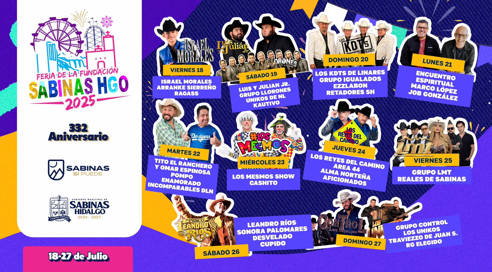 Del 18 al 27 de julio, el municipio de Sabinas Hidalgo, en el estado de Hidalgo, celebrará su Feria de la Fundación sabinas Hidalgo 2025, una de las festividades más representativas de la región. Durante estos días, las calles se llenarán con actividades para toda la familia y una atractiva programación artística en el Teatro del Pueblo, donde se presentarán estupendos artistas que pronto serán anunciados de forma oficial.