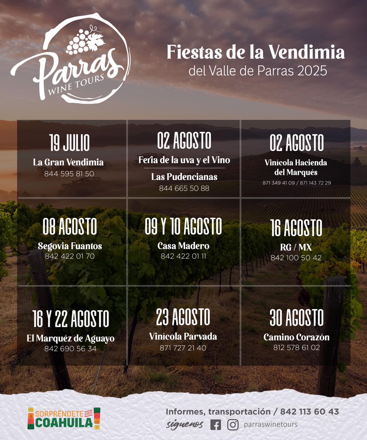 Del 1 al 17 de agosto, el municipio de Parras de la Fuente, Coahuila, celebrará una nueva edición de la Feria de la Uva y el Vino Parras 2025, una de las festividades más tradicionales del norte del país y una referencia en el calendario turístico y cultural del estado. Esta celebración, que coincide con la temporada de vendimia, celebra la vocación vitivinícola de la región y a sus raíces religiosas, en particular a la Virgen de la Asunción.