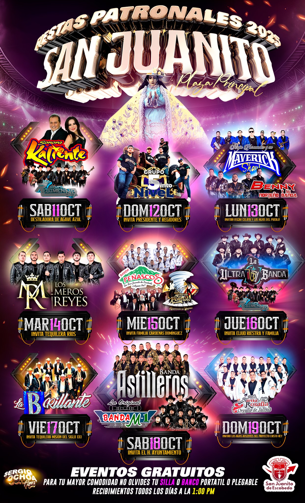Del 11 al 19 de octubre de 2025 se celebrarán las Fiestas Patronales de San Juanito de Escobedo, Jalisco, una de las celebraciones más esperadas por los habitantes del municipio y sus alrededores. Los festejos se realizarán en la plaza principal, donde se presentarán agrupaciones reconocidas como Banda Los Astilleros, Grupo 5to Nivel, Los Meros Reyes y Banda M1, que encabezarán el programa musical de esta edición.