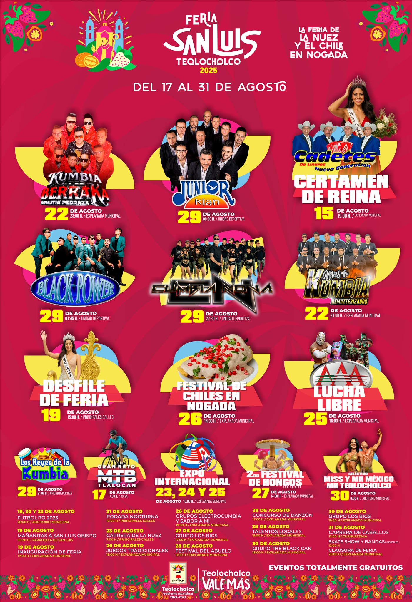 La Feria de la Nuez y el Chile en Nogada de San Luis Teolocholco 2025 tendrá una programación estupenda del 17 al 31 de agosto. La celebración arranca con una emotiva fiesta patronal en honor a San Luis Obispo de Tolosa. Los festejos comienzan la noche del 17 de agosto, cuando cientos de jóvenes acuden a la parroquia para entonar las tradicionales mañanitas. Durante toda la madrugada se mantiene un ambiente de fervor: mariachis, teponaztle, cantos, rezos y ofrendas florales acompañan el evento y atraen a miles de personas a la iglesia hasta que amanece el 19, día en que la imagen del santo es felicitada solemnemente.