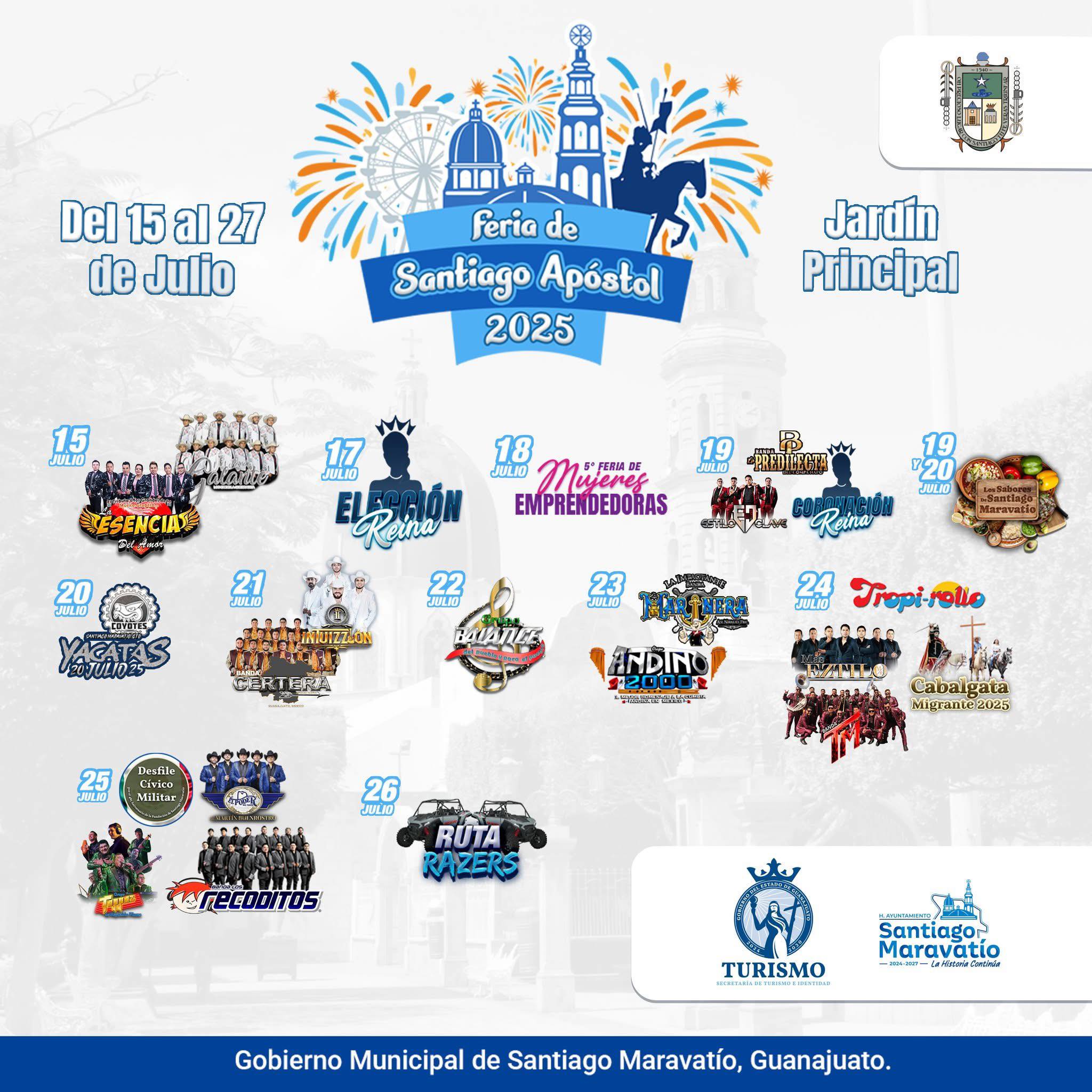 La Feria Santiago Maravatío 2025 o Fiestas de Julio Santiago Maravatío 2025 ya tiene cartelera artística del 15 al 27 de julio. Es el evento más esperado del año en este municipio del estado de Guanajuato. La feria se celebrará como cada año en honor a Santiago Apóstol, santo patrono del pueblo, con una amplia agenda de actividades, entretenimiento, cultura y tradición.
