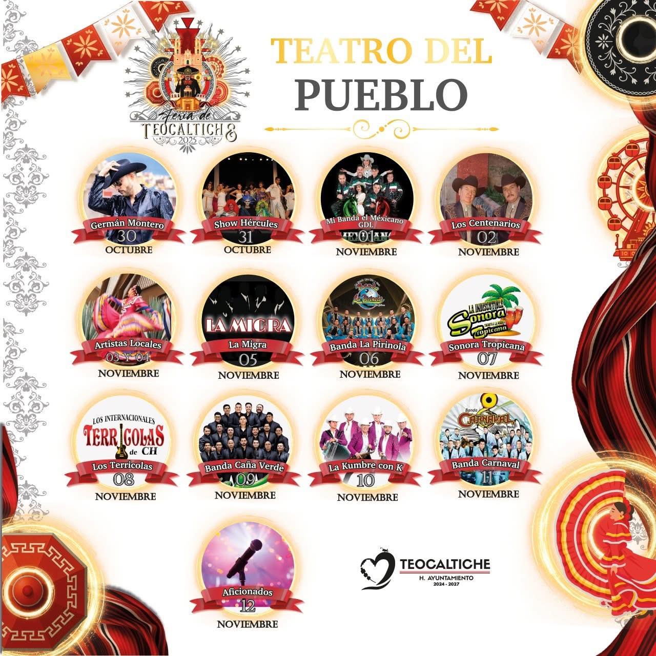 En ediciones pasadas, el teatro del pueblo ha contado con la presencia de agrupaciones y artistas como la Sonora Santanera, Los Freddys, Los Cadetes de Linares, Banda R15, El Bebeto, además de espectáculos de comedia, bailes folclóricos y el esperado certamen Señorita Teocaltiche.