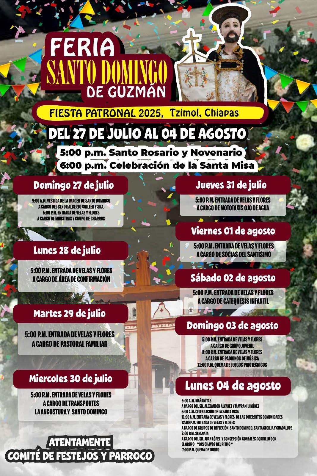 Del 27 de julio al 4 de agosto, el municipio de Tzimol, Chiapas, se prepara para rendir homenaje a su santo patrono, Santo Domingo de Guzmán, con una serie de actividades religiosas y culturales que dan continuidad a una de las celebraciones más significativas para la comunidad.