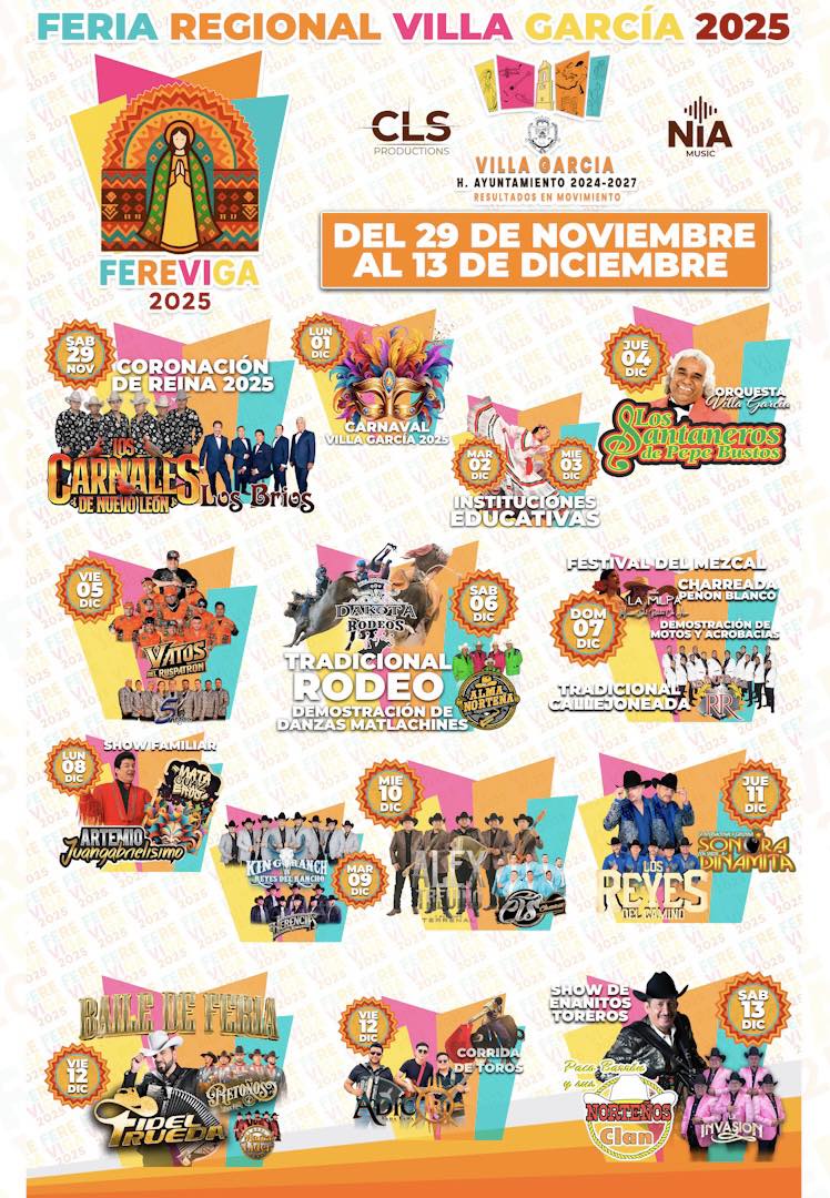Del 29 de noviembre al 13 de diciembre acude a la Feria Villa García 2025, también conocida como FEREVIGA. Aquí podrás disfrutar de excelentes eventos artísticos y culturales, folclor, bailes de feria y mucha diversión y entretenimiento para toda la familia.
