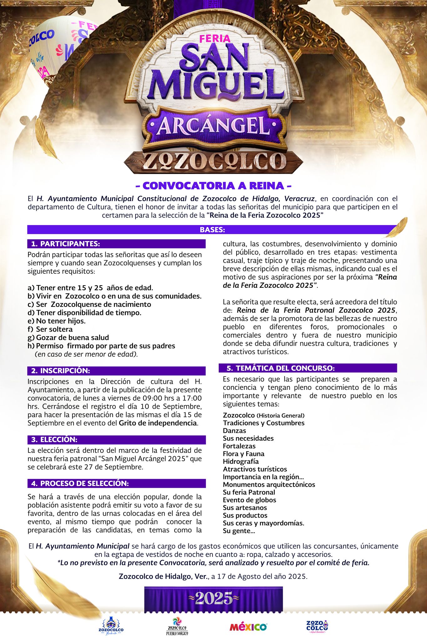 Uno de los momentos más esperados será el certamen de elección de la Reina de la Feria Zozocolco 2025, cuya convocatoria ya está abierta para las jóvenes zozocolquenses. Las participantes serán evaluadas en temas relacionados con la historia del municipio, sus tradiciones, costumbres, danzas, gastronomía, artesanía, flora, fauna y atractivos turísticos. La elección se llevará a cabo el 27 de septiembre, como parte del arranque oficial de las festividades.