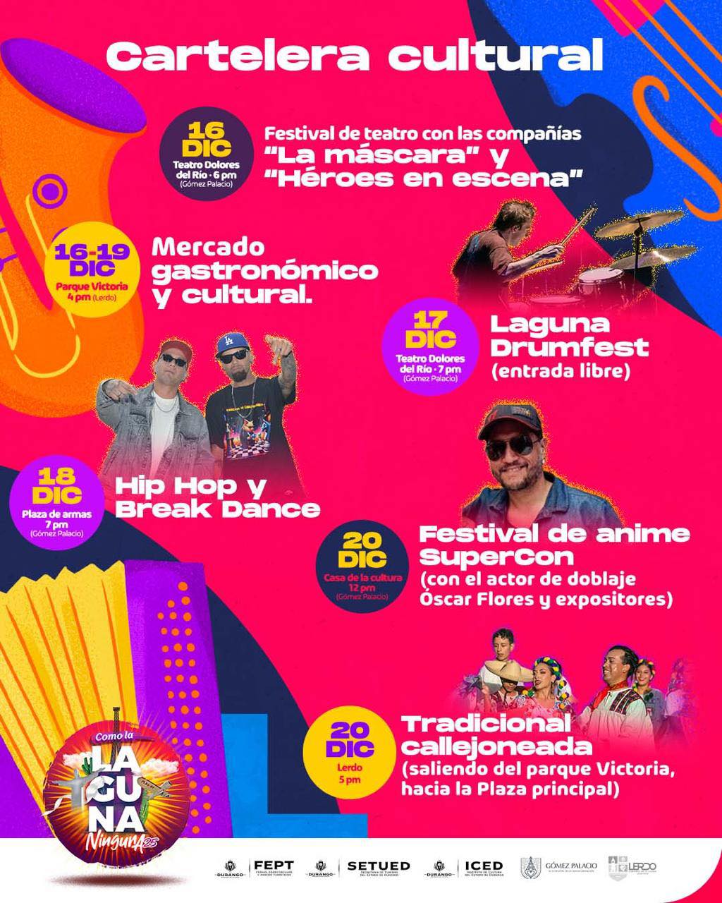 El arranque será el 16 de diciembre con Alemán en Gómez Palacio y, ese mismo día, el inicio del festival de teatro en el Teatro Dolores del Río a las 6 pm, además del mercado gastronómico y cultural en el Parque Victoria en Lerdo. El 17 de diciembre se presentará Pablo Montero, mientras que el teatro continuará a las 7 pm en el Dolores del Río. El 18 de diciembre llegará Lorenzo de Monteclaro a Lerdo y, en Gómez Palacio, se realizará la exhibición de Hip Hop y Break Dance en la Plaza de Armas a las 7 pm. Para el 19 de diciembre, Inspector encabezará el concierto en Gómez Palacio.