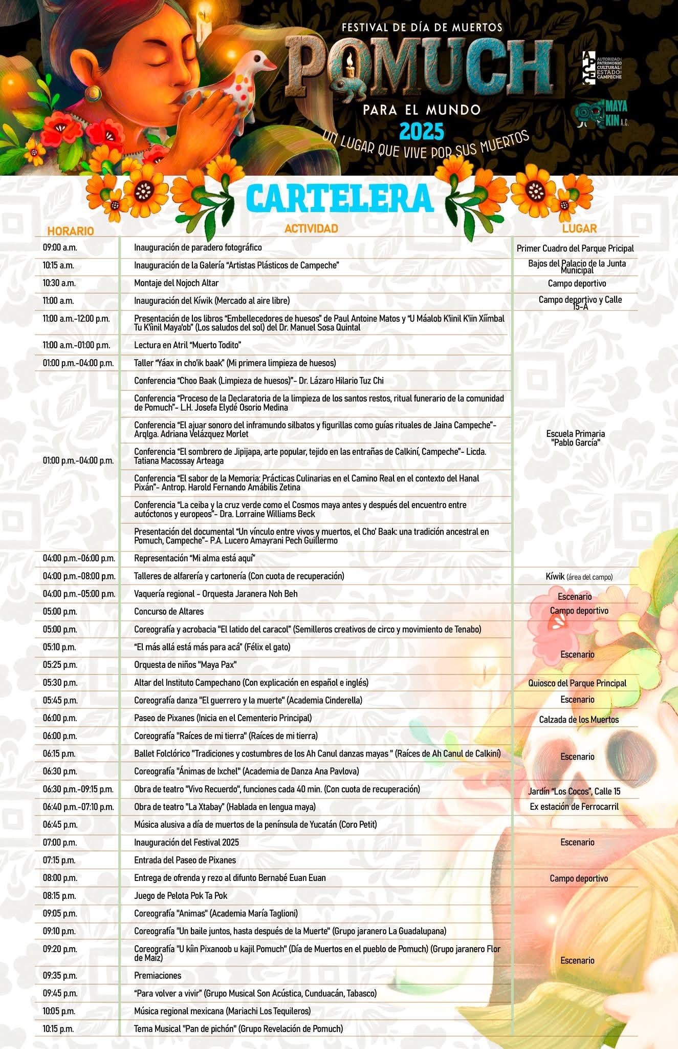 El cartel y la programación del tradicional festival de día de muertos pronto estará disponible. El Festival de Día de Muertos Pomuch 2025 rendirá homenaje a la cultura maya y sus tradiciones con los fieles difuntos. Todo se vestirá de flores cempasúchil, luces de velas, altares y pan de muertos.