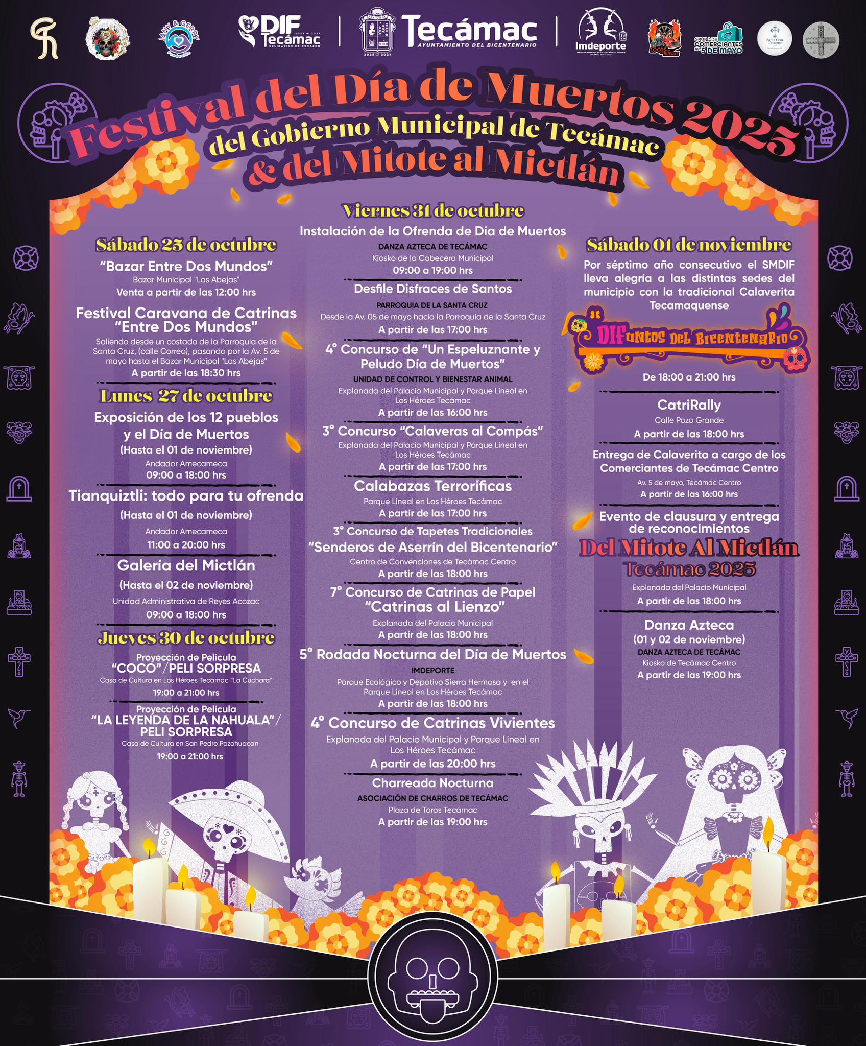 Entre los eventos más destacados se encuentran la instalación de la ofrenda monumental, el Desfile de los Santos Difuntos, la Galería del Mictlán, el Tianquiztli, la exposición de altares y ofrendas, y los concursos de catrinas, tapetes de aserrín, calaveras literarias y calabazas decoradas. Además, habrá funciones de cine como Coco y La Leyenda de la Nahuala, la Rodada Nocturna del Día de Muertos, una charreada tradicional, y la presentación de la Danza Azteca de Tecámac, que cerrará el festival el 1 de noviembre en la explanada municipal.