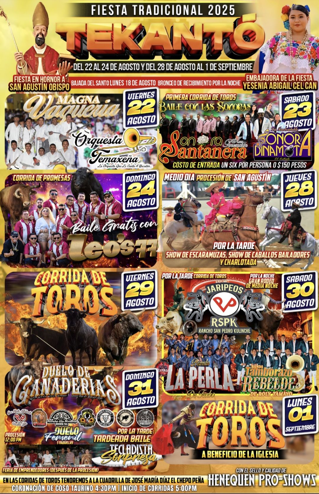 El municipio de Tekantó, Yucatán, se prepara para celebrar su tradicional fiesta en honor a San Agustín Obispo, uno de los eventos más esperados en esta región del oriente del estado. La Fiesta Tradicional Tekantó 2025 se llevará a cabo en dos bloques: del 22 al 24 de agosto y del 28 de agosto al 1 de septiembre, con un programa que incluye actividades religiosas, el folclor local y espectáculos ecuestres y musicales.