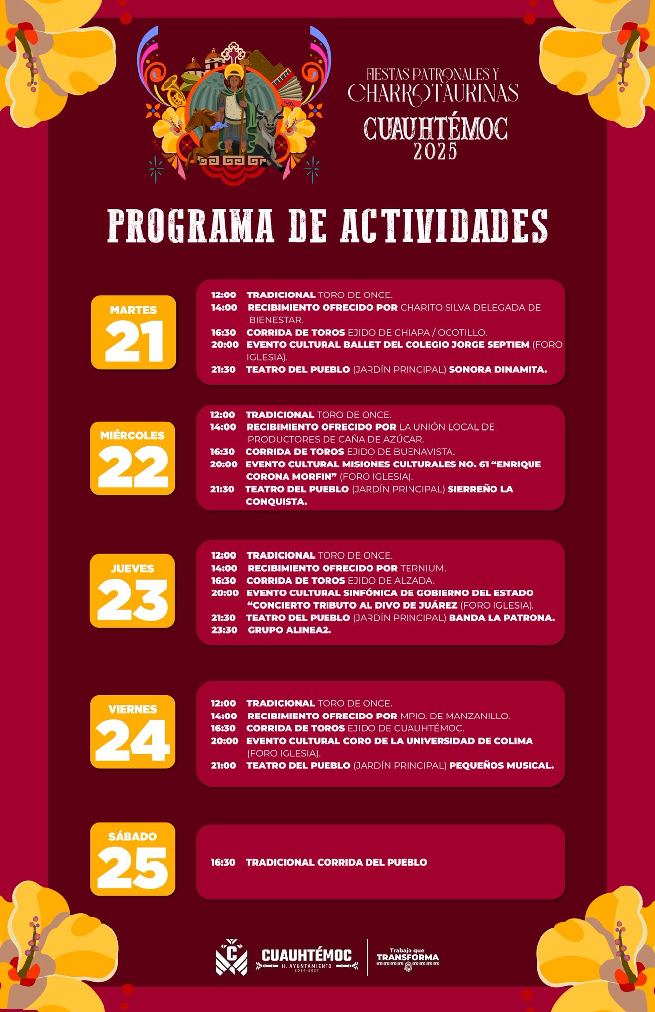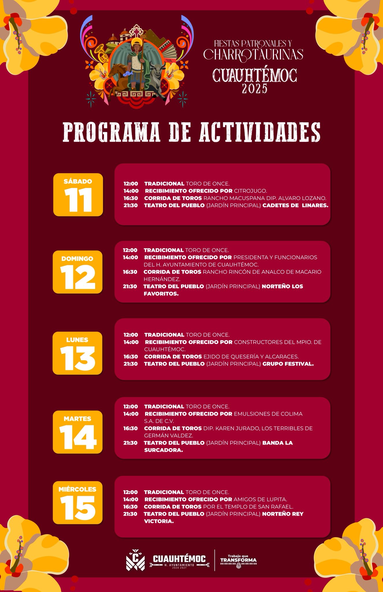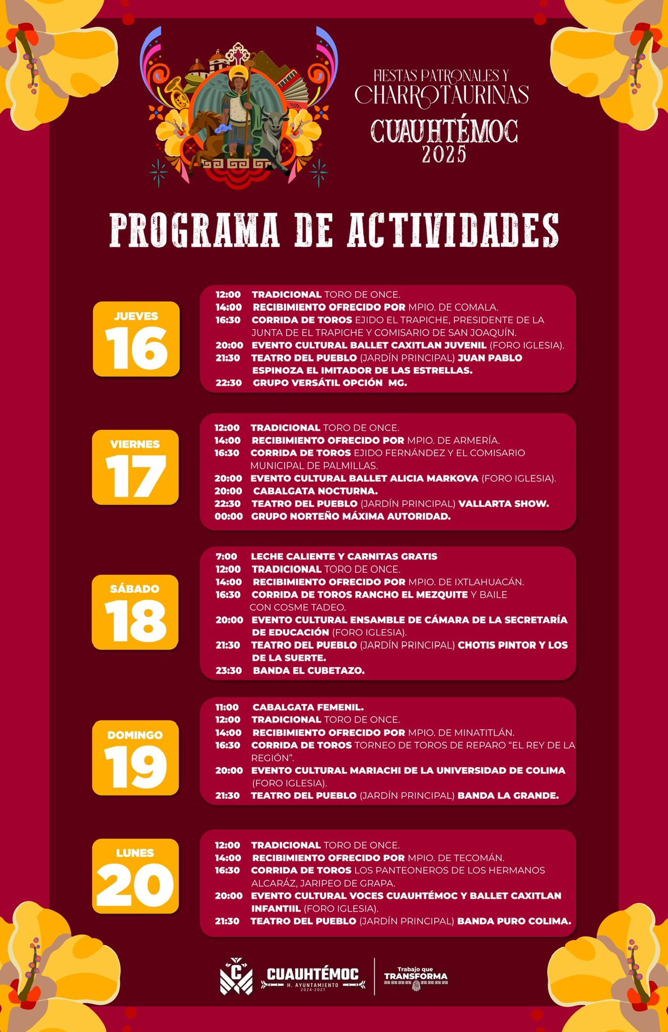 Durante más de dos semanas, las calles y plazas de Cuauhtémoc se llenarán de alegría con un programa cultural, artístico y taurino que refleja la identidad colimense. Las actividades charras ocuparán un lugar central, con cabalgatas, jaripeos, rodeos, desfiles y la tradicional expo ganadera, donde se exponen ejemplares de la región y se realizan competencias ecuestres que atraen a aficionados de todo el país.