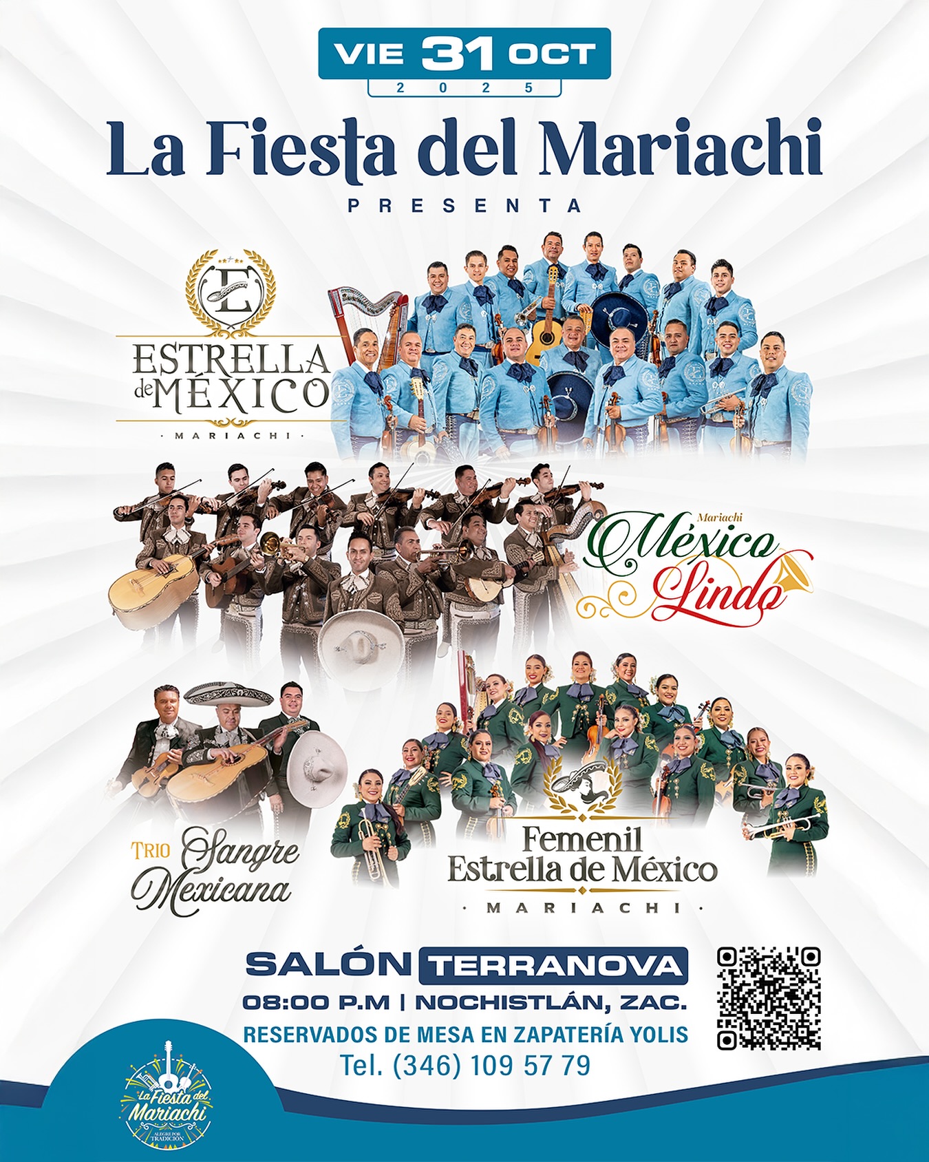 El ambiente musical tendrá su máxima expresión con La Fiesta del Mariachi, programada para el viernes 31 de octubre en el Salón Terranova, donde actuarán agrupaciones de primer nivel como Mariachi Estrella de México, Mariachi México Lindo, el Trío Sangre Mexicana y el Mariachi Femenil Estrella de México, todos exponentes del género más representativo de la música mexicana.