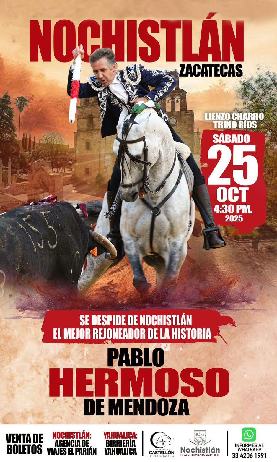 Entre los eventos más destacados de este año figura la despedida del rejoneador Pablo Hermoso de Mendoza, quien se presentará el sábado 25 de octubre a las 4:30 p. m. en el Lienzo Charro Trino Ríos, en un espectáculo que promete reunir a los aficionados a la tauromaquia de toda la región.