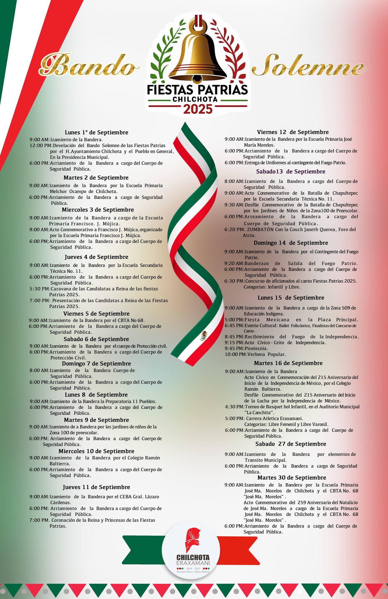 Las Fiestas Patrias 2025 en Chilchota, Michoacán, cuentan con un extenso programa cívico, cultural y deportivo que se desarrollará del 1 al 30 de septiembre. El ayuntamiento municipal, en conjunto con instituciones educativas y organizaciones locales, ha calendarizado ceremonias de izamiento de bandera, actos conmemorativos, desfiles, concursos, presentaciones artísticas y eventos deportivos que buscan mantener vivo el espíritu de independencia y la participación comunitaria.