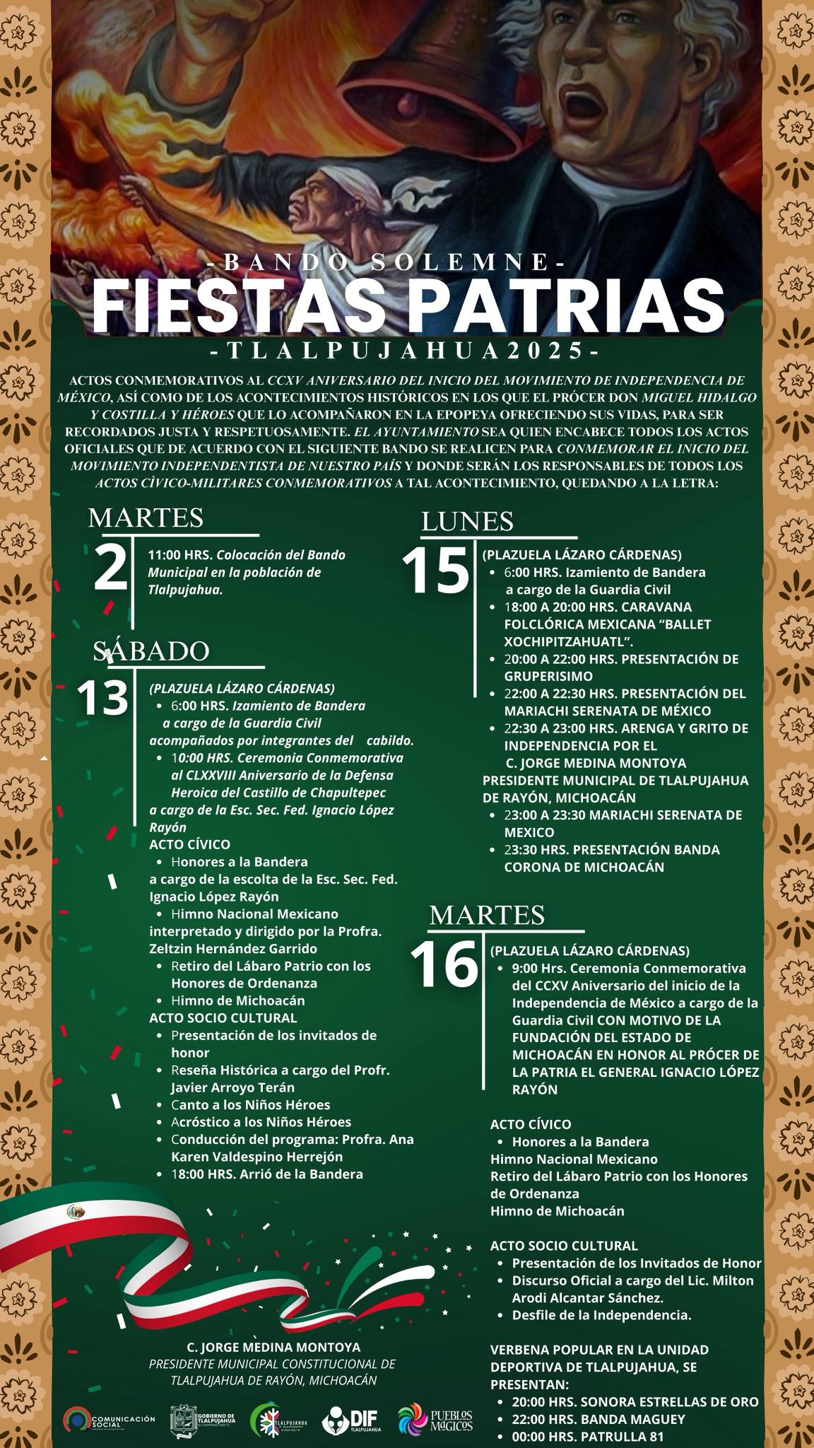 El municipio de Tlalpujahua, Michoacán, dio a conocer el Bando Solemne 2025 con el que se formalizan las actividades para conmemorar el CCXV aniversario del inicio del movimiento de Independencia de México. El programa incluye actos cívicos, ceremonias conmemorativas, presentaciones artísticas y una verbena popular que se extenderá del 2 al 16 de septiembre, enmarcando las fechas más significativas del mes patrio.