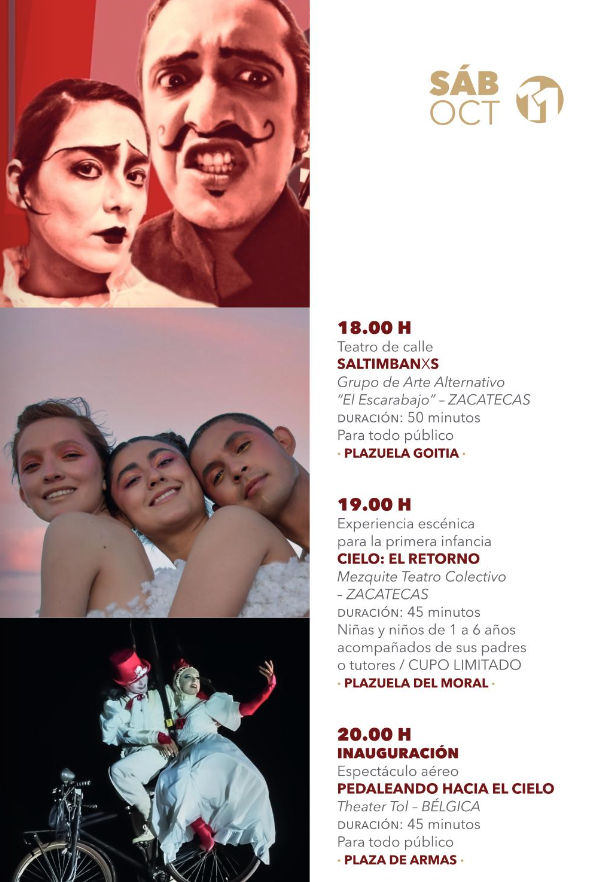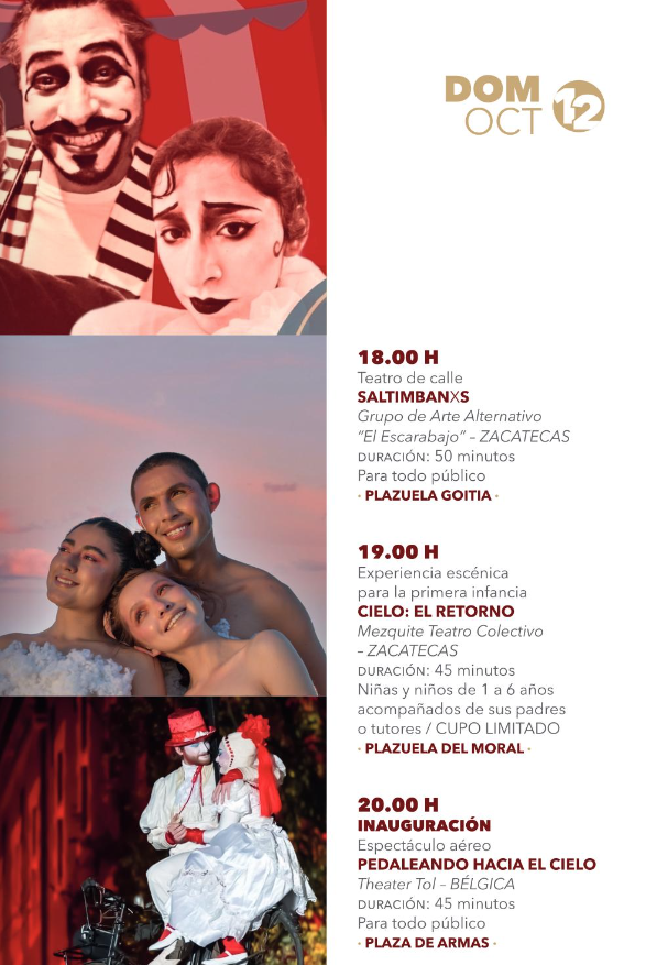 Este festival se realiza en Zacatecas desde el año 2002 y cada mes de octubre convierte a la ciudad en un escenario vivo, donde plazas, callejones y plazuelas se llenan de histrionismo, música, danza, fiesta cultural y espectáculos gratuitos para todo público. Además, el programa 2025 contempla presentaciones en municipios como Guadalupe y Fresnillo, lo que permite que la oferta artística llegue a más comunidades del estado.