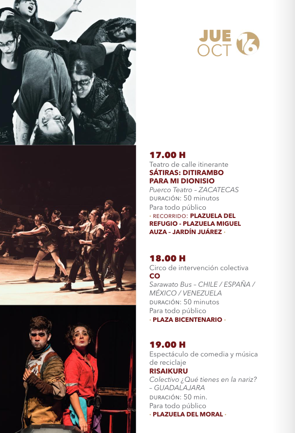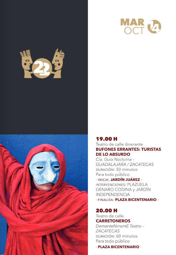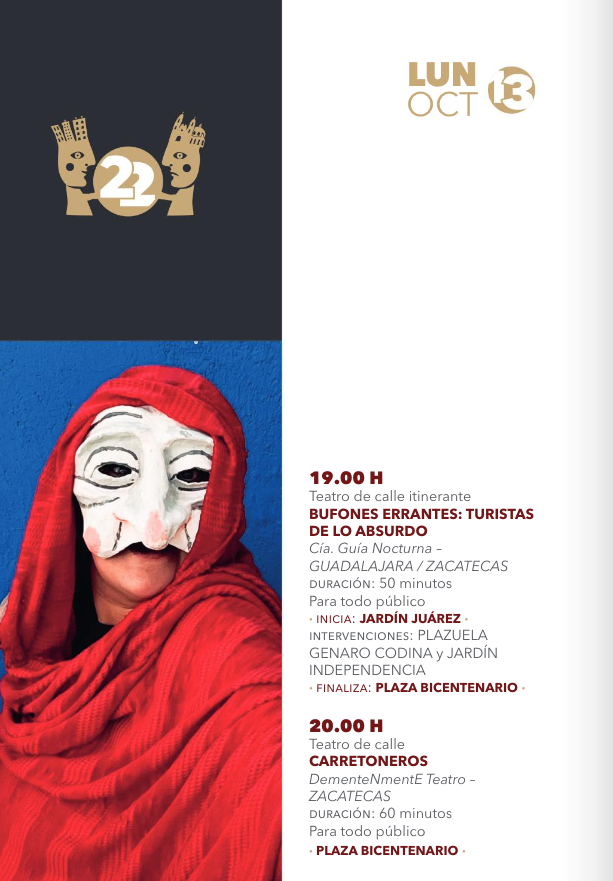 • 19:00 hBufones errantes: Turistas de lo absurdo (Teatro itinerante) – Cía. Guía Nocturna – Guadalajara/Zacatecas – Jardín Juárez / Plazuela Genaro Codina / Jardín Independencia / Plaza Bicentenario