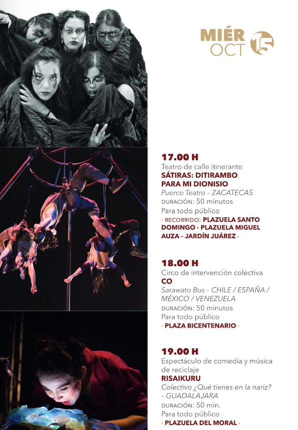 • 17:00 hSátiras: Ditirambo para mi Dionisio – Puerco Teatro – Zacatecas – Plazuela Santo Domingo / Plazuela Miguel Auza / Jardín Juárez