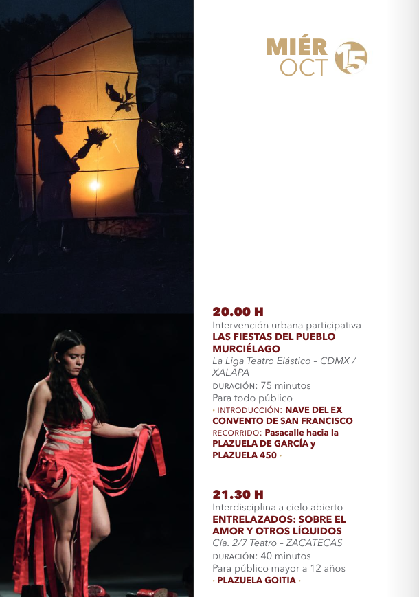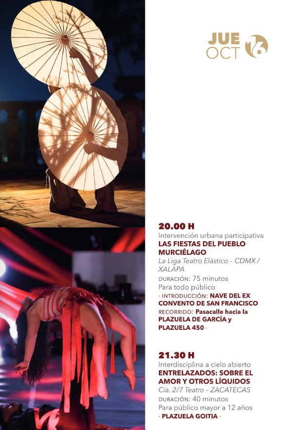 • 20:00 hLas Fiestas del Pueblo Murciélago – La Liga Teatro Elástico – CDMX/Xalapa – Recorrido: Nave del Ex Convento de San Francisco – Plazuela de García – Plazuela 450