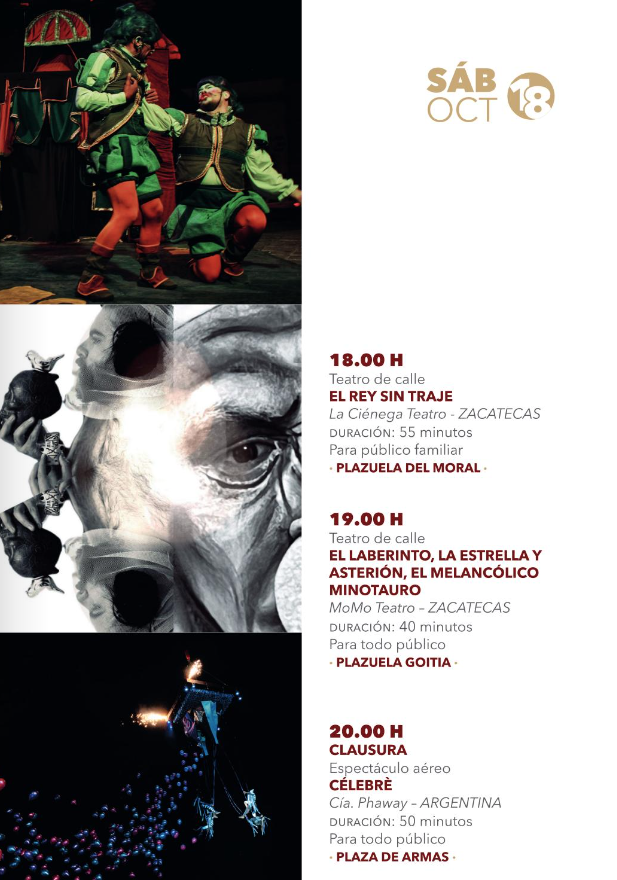 • 18:00 hSaltimanbxs (Teatro de calle) – Grupo de Arte Alternativo El Escarabajo – Zacatecas – Plazuela Goitia