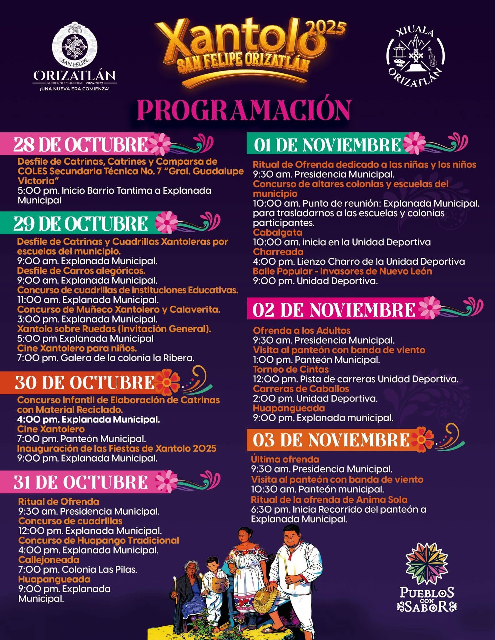 Durante siete días, las calles, escuelas y barrios del municipio se llenarán de comparsas, altares, desfiles y danzas xantoleras que mantienen viva una de las costumbres más representativas de la región. El programa oficial de actividades incluye desfiles de catrinas y cuadrillas, concursos de altares y carros alegóricos, exhibiciones de cine, cabalgatas, eventos deportivos y la participación de grupos artísticos locales.